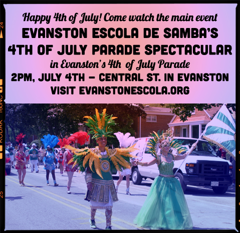 The big EEDS 4th of July parade is less than 3 weeks away – but there’s still time to join! Our 3-week Bateria Bootcamp starts tomorrow, Wednesday the 18th at 6:30 PM, and registration is still open for all percussionists (all levels welcome and instruments provided)! If you don’t want to play in the bateria, we are also looking for volunteers to help and people who just want to march alongside and have a good time on Friday, July 4th! If you are interested in volunteering or marching in the parade with us, shoot us an e-mail at Evanstonsamba@gmail.com